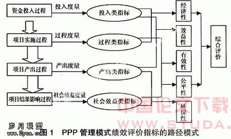 2 建立健全绩效评价机制。绩效评价是一种有效的管理方法,通过绩效评价可以对公私合作的PPP进行更有效的管理。任何绩效评价机制都有三个基本要素:评价指标、评价标准和评价方法。建立绩效评价体系应包括评价主体、评价对象和评价方法。评价主体应该具有独立性,否则将缺乏公平性;评价对象应该明确、清晰,应该包括评价的内容;评价方法应该既有原则性。又有灵活性,因地制宜。对于绩效评价,人们越来越重视财务、经济、技术、环境和社会福利(公平)等各方面的综合、协调、评估。因此,同样把绩效评价的内容拓展为5E。即:经济性(economy)、效率性(efficiency)、效果性(effectivenss)、公平性(equitv)、环保性(environmental protection)作为选择PPP管理模式的基本原则。5E相辅相成。系统、全面、综合地评价项目绩效。PPP管理模式绩效评价指标的路径模式如前页图1所示。