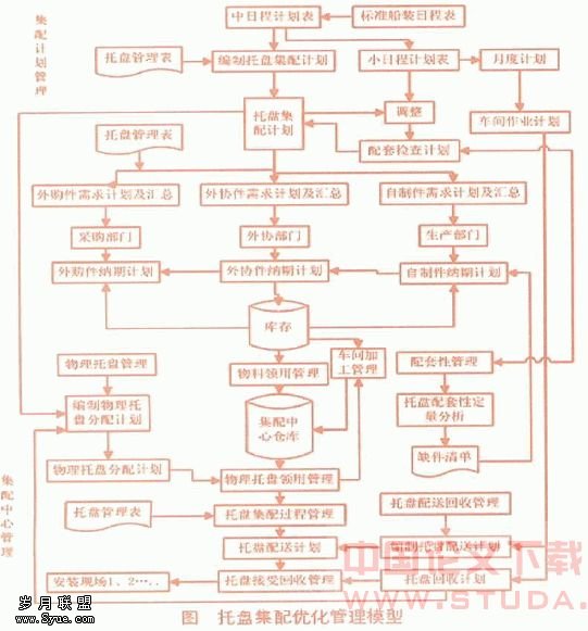 根据生产计划编制托盘集配计划,进而生成舾装件需求计划,经过物资平衡后,生成外购、外协和自制舾装件纳期计划。集配中心根据托盘集配计划进行托盘预配套和现场集配;同时根据车间作业计划完成托盘的配送和回收工作。托盘集配的两个关键环节是托盘集配计划编制和集配中心管理,为此提出了托盘集配优化管理模型如图。