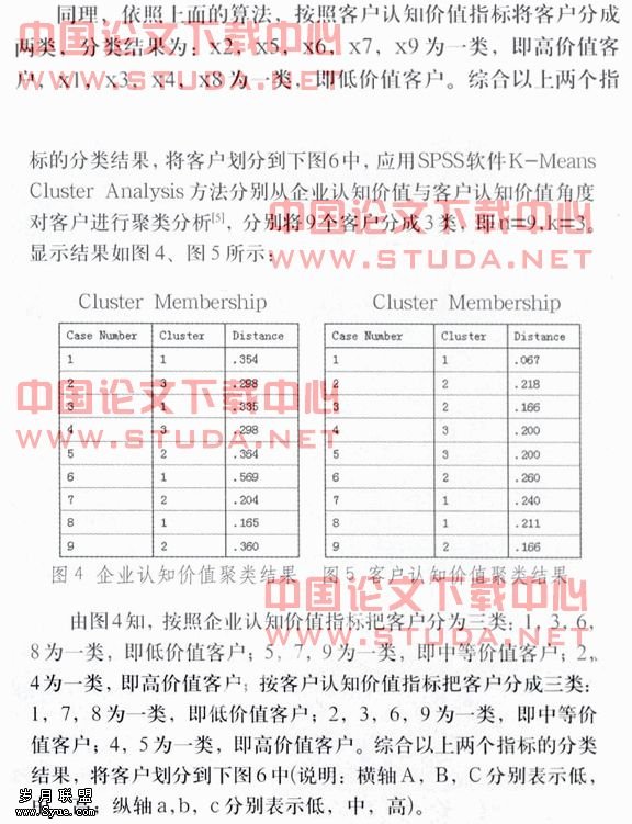 本文采用权重评分法将定性指标分等级并赋予权值,如客户满意度指标分为很满意、满意般、不满意、很不满意,相应设置权重为5、4、3、2、1。以认知价值评价为例,采用聚类分析方法将9个客户分成3类,即n=9,K=3。