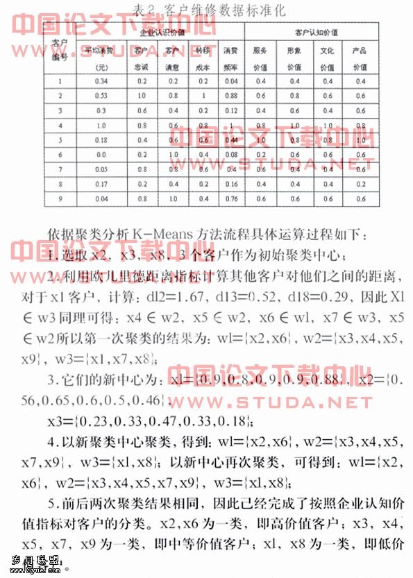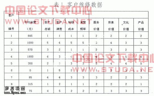 每个客户均由9个指标来描述其属性,指标体系中除去干均消费指标和交易次数指标外,其他均为定性指标,本文采用权重评分法将定性指标分等级并赋予权值,如客户满意度指标分为很满意,满意、一般、不满意、很不满意,相应设置权重为5、4、3、2、1。首先,采用数据标准化方法对数据进行处理,将定性指标和定量指标统一量纲后如表2所示: