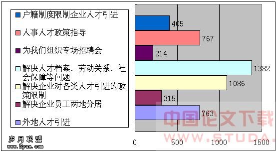 1.政策引导。就是通过制定并实施相应的人才政策,为人才建立良好的政策环境,规范组织的人才开发管理行为,保障人才的合法权益,引导人才价值的有效发挥。尤其是体制外人才的开发管理工作,政府应开展调查研究,制定富有针对性的人才开发管理政策法规,以防止出现某些侵害人才合法权益的“空挡”、“死角”。根据调查,企业人才认为当前“解决人才档案、劳动关系、社会保障”是政府在制定企业人才政策时急需解决的问题。(林泽炎主编,《中国人力资源发展报告:中国企业人才优先开发——政策评价与战略思路》,中国劳动社会保障出版社,2006年8月版。)具体情况见下图。?