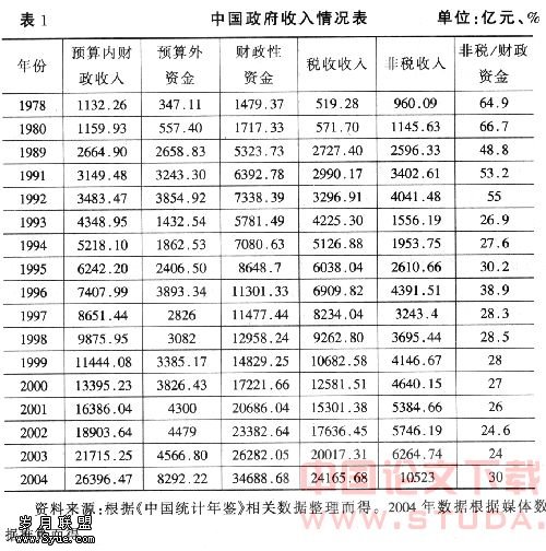 根据下页表1所提供的资料。我国非税收入由1978年的960.09亿元,增长到2004年的10532亿元,26年中增长了10.95倍。由于缺乏完整的统计资料,此处的非税收入规模是采用《中国统计年鉴》公布的预算内财政收入、预算外财政收入和税收收入的数据来估算的(非税收入=预算内财政收入+预算外财政收入-税收收入)。从我国现实情况看,大量的制度外收入及政府出卖土地收入等非税收入项目还没有统计进来,表中数字没有全面反映我国非税收入的现状。即使如此,我国非税收入占财政性资金的比重在1980年为66.7%,1991年达到53.2%,目前也达到30%左右。