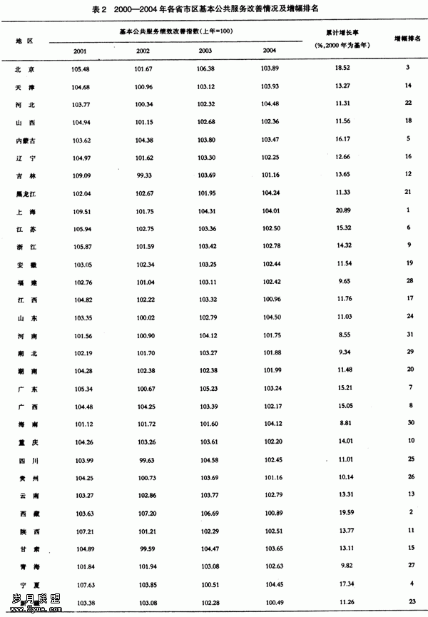 (1)总体看,近年来各地基本公共绩效都取得一定程度的改善,但改善速度远远落后于各地区的经济增长速度和财政支出增长速度,总体改善幅度不是十分显著。2000—2004年间,基本公共服务累计改善幅度有17个省份在10%—20%,有 14个省份都在10%以下(见表2);而同时期人均GDP累计增幅最小的省份也为43%(海南),最大的为93% (内蒙古),同期人均财政支出最小增幅为56%(云南),最大的达到144% (浙江)。说明在我国经济和财政支出总体快速增长的同时,基本公共服务总体投入不足,公共支出结构不合理,非公共服务支出比重偏高。