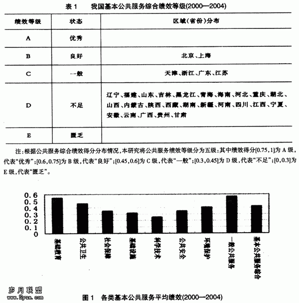 (1)从投入、产出和效果三方面综合评估,我国基本公共服务综合绩效整体处于偏低的水平。除基础教育北京达到A级,一般公共服务上海、北京达到A级以外,其他各地区各类公共服务绩效等级都处于 B级以下。从2000-2004年5年的平均水平看,则所有地区基本公共服务综合绩效都处于B级以下(见表1)。基本公共服务供给不足的矛盾十分突出。区域分布上,基本公共服务绩效整体东部优于中西部、经济发达省份优于经济落后省份。这主要是因为经济发达地区财力状况好于欠发达地区,基本公共服务领域的投入也更多,在基本公共服务与经济增长互为因果、互相推动下,加上多年来的不断积累,共同促成了目前的区域分布格局。