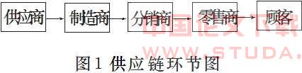 供应链是围绕核心企业,通过信息流、物流(产品和相关服务流)、资金流的控制,从采购原材料开始,制成中间产品以及最终产品,最后由销售网络把产品送到消费者手中的将供应商、制造商、分销商、零售商直至最终用户连接成的一个整体的功能供应链结构模式。供应链环节如下图1所示: