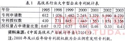 ①专利申请量与授权量。据统计资料,我国高新技术企业技术创新积极性不断提高,专利申请持续快速增长,2002年高技术产业申请专利5 590件,较上年3 379件增长了65.4%,2003年高技术产业专利申请8 270件,较上年增长47.9%;同年,国内专利申请居前十位的企业中有八个是高新技术企业。但从高技术行业专利申请量与授权量总体情况看来,虽然申请量与授权量持续增长,但授权量占申请量的比重则在波动中呈下滑趋势(见表1)。