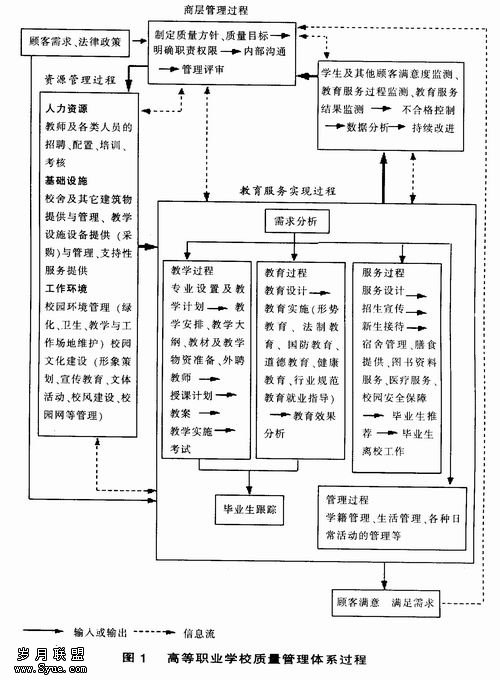 1.高层管理过程。高层管理过程是学校高层领导执行质量管理职能的过程,包括学校质量方针、质量目标的制定,各部门、各岗位的质量职责以及各部门、各岗位之间相互关系的确定,以及质量管理组织机构的建立。高层管理过程是质量管理体系的首要过程,它要保证机构和职能分配与学校质量方针、质量目标以及质量管理体系的要求相适应,真正做到职责分明、授权充分、关系清晰,能对质量问题快速反应、及时沟通和处理。质量管理体系应有相应的组织机构作为支撑.这种组织机构不同于学校的行政管理机构,它是保证质量管理体系畅通运行的组织系统.包括院级教育质量管理委员会(或领导小组)、质量管理专职机构(如质量管理处、贯标办公室)和具有教育服务提供职能的部门(如教学部门、学工部门、服务部门)等。 2.资源管理过程。资源包括人力资源、基础设施、工作环境、信息等,它是学校进行教育服务的条件,或者说是教育服务过程的输入。资源管理过程是指对学校所拥有或应当拥有的资源进行组织、协调、控制和改进,以保证这些资源正常发挥其效用的过程。教育服务的质量与其输入的资源直接相关,因此,资源管理系统的根本任务就是为学校教育服务的进行以及教育质量管理提供必要条件。资源管理的目标是通过确定并提供所需的资源使质量管理体系得以实施,保持其有效性;通过满足顾客要求,增强其满意度。在高职院校的资源管理中,教师的管理是一个关键过程。这是由于教育服务质量的高低,同教师的学识、人品、教学能力和教学方法密切相关;同时,教师的授课过程是一种难以“由后续的监视或测量加以验证”的特殊过程,因此教师的资格、能力、态度等方面的控制更为重要。 3.教育服务实现过程。教育质量是在教育服务的设计和提供过程中形成的,因而对教育服务实现过程的管理是保证教育质量的重点。如图1中的“教育服务实现过程”所示,该过程的起点是顾客需求分析,要在顾客需求分析的基础上识别教育服务的质量特性,确定教育服务的质量目标、要求和约束条件,这是教育服务设计和开发的前提。教育服务设计和开发包括专业与教学设计、教育内容及方式设计以及服务设计等,其中核心部分是专业与课程设计,它是教育质量特性形成的基础。因此,过程管理中首先要抓好上述两个环节。其次,教育服务的提供(如教学实施、教育和管理实施、各种服务提供等)也是质量管理的一个关键点。它的突出特点是“消费与生产”的不可分割性,即教育服务的实现过程,同时又是它的交付过程,不象