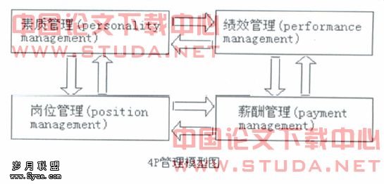 人力资源管理是对组织人力资本的管理,即对人力资源进行计划、组织、控制,使得人力和物力保持最佳比例。其管理工作主要包括人才引进、素质管理、岗位管理、绩效管理和薪酬管理、人才外包等。而企业人力资源管理的核心必须围绕企业战略这个中心来展开,并以“人”和“岗位”作为两个立足点,因此这样的管理内容就形成一种以4P管理模型为核心的管理模式,这种4P管理模型如以下的图1所示。