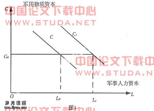 一方面,军事人力资本的积累通过提高军事人力资本的生产效率,增强军队官兵的技能和战术水平,从而产生即使在军事技术、军事物质资本投入等其它条件不变的情况下,有效的军事劳动投入得到增加,战斗力提高,即国防安全的产出增大。如图1所示,OG是物质资本(武器装备、训练设施等)投入量,OL是军事劳动投入量,在GL的配合下进行军事活动,形成战斗力等效能线C。假定军事技术水平、物质资本投入和人数不变,随着军人素质提高,即增加人力资本存量,实际的军事人力资本投入量由L0增加为L1时,相应战斗力从C增加到C1。