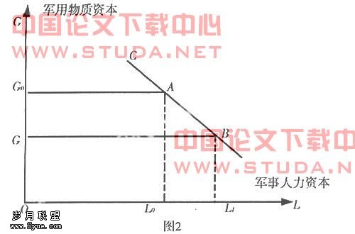 另一方面,军事人力资本的积累可以提高物质资本的生产效率,节约高技术武器装备的投入。科技的发展促使武器装备的更新周期不断缩短,而且装备结构复杂,军事劳动的复杂程度增加,军事人力资本的积累将使新军事高科技装备的使用效率提高,而且使原有装备发挥更大的效能,起到用有效军事劳动替代稀缺高技术武器装备,提高产出的作用。如图2所示,由原有的OG0和OL0结合产出战斗力等效能线C,在保持原有兵力,提高军人人力资本存量,由OL0提高到OL1,则在维持C战斗力水平,只需投入OG1物质资本(武器装备、训练设施等),物质资本节约G0G1,整个战斗力产出效益节省R=OG0AL0-OG1BL1。