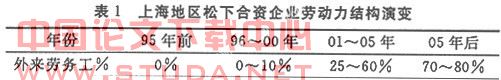 外来劳务工已经成为企业生产的主力军,外来劳务工占企业员工的比例逐步增加,以上海地区的松下企业为例,表1 说明了该公司外来劳务工的增加情况。2008年共有员工5,600人,其中生产线员工计4,450人,外来劳务力有3,350人,占总比例 75%。