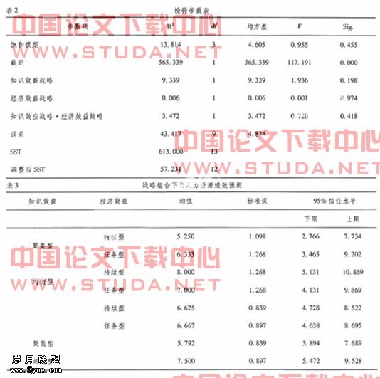 采用二因素方差分析方法确定经济效益战略与知识效益战略混合的“配合”效果。二因素方差分析(Two-Way ANOVA)可用于分析两个因素对因变量的影响情形,如笔者用于分析任务型或持续型、聚集型或均衡型人力资源绩效管理战略对资源型城市人力资源绩效的影响。二因素方差除探讨两个个别因素的影响,即A因素的方差(SSA)与B因素的方差(SSB),称为主效应外,还考虑其对应变量的交互效应。交互效应越大,两因素的合力对因变量的作用越明显。二因素方差分析不一定有交互效应,当Two-Way ANOVA考虑交互作用项时,总效应可分解为SST=SSA+SSB+SSAB+SSE。通过验证两种类型的人力资源绩效管理战略的“配合”对人力资源绩效的影响,从而为我国资源型城市寻找科学的人力资源绩效管理战略组合模式。本文的所有数据处理过程采用SPSS软件完成。