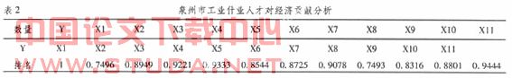 结果表明,数量与工业产值的相关系数排名依次是:中级工(X11),高中生(X4),大学专科生(X3),初级技术人员(X7),本科生(X2),高级工(X10),中级技术人员(X6),高级技术人员(X5),技师(X9),研究生(X1),高级技师(X8)。从这个结果可以大致看出,目前泉州市的工业经济还主要是依托量的投入的粗放型经济,人才对于的经济贡献还比较低。因此需要加快经济转型的步伐。