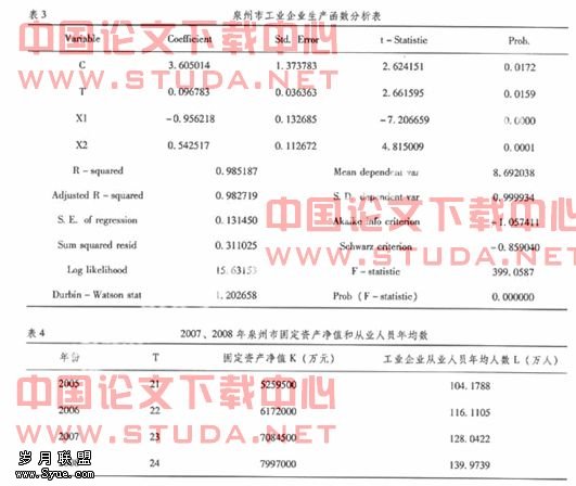 将T=24,K=799.7,L=1399739带入回归方程LOG(Y)=3.6050+0.0968T-0.9562LOG(L)+0.5425LOG(K),算得Y=41773416万元,即由此回归模型预测的2008年泉州市的工业企业的生产总值将达到41773416万元。