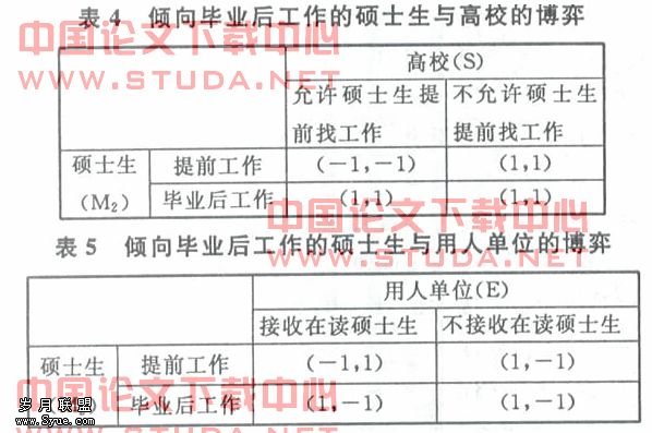迫于压力以及别的原因不得不提前找工作的硕士生只要高校允许,就会达成(-1,-1)的局势,若高校不允许硕士生提前找工作并为其提供必要的生活补助,则硕士生和高校仍能达到“双赢”的结果。当硕士生不存在经济困难或自己另想办法克服了困难时,必然会坚持好好完成学业,毕业后工作的选择,这种情况中高校与硕士生总是“双赢”。所以高校不允许硕士生提前找工作和硕士生选择毕业后工作是这一博弈中的双方最优决策。