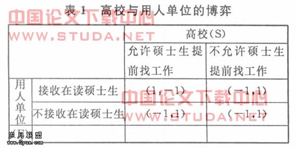 当高校允许硕士生提前找工作时,若用人单位选择接收在读硕士生则能得到满意的结果,而高校则因此不满意(1,-1);若用人单位选择不接收在读硕士生则必定不满意,而因为在读硕士生即便找工作也没有接收单位,所以高校最终得到满意的局势(-1,1)。当高校不允许硕士生提前找工作时,硕士生受到纪律限制,则高校不管怎样都将得到满意的结果,而用人单位无论做何种选择都接收不到在读硕士生,结果必定是不满意(-1,1)。