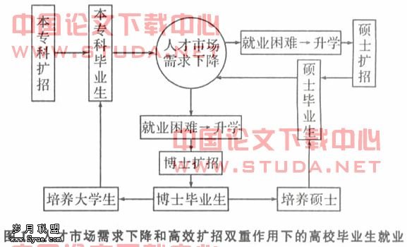 如图1所示:大学生就业困难,于是转向升学,升学需求的增加迫使硕士扩招。硕士毕业生的增加使人才市场的竞争更加激烈,在挤占大学生就业岗位的同时也造成自身就业水平的下降,因而出现了所谓“1500应届硕士竞聘卖猪肉”、“十万年薪聘请大学生掏粪”的新闻现象。并且,由于预计2010年博士学位的年授予人数将达到突破性的5万,已经开始有学者开始担心博士培养质量的下降,质量下降的博士毕业生以后还要去培养硕士生和本专生,势必进一步造成硕士毕业生和本专科毕业生质量的下降,从而更加剧了他们的就业压力,令他们倾向于尽早适应市场,做出提前工作地选择。