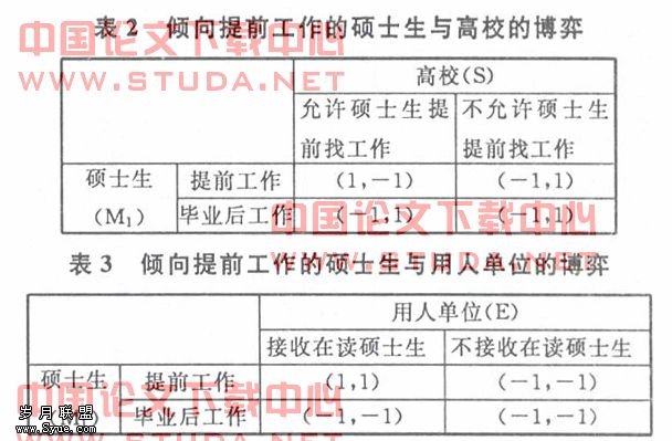 由此可以分析得出,高校与用人单位的博弈达到一个上策均衡,即高校不允许硕士生提前找工作,用人单位却接收在读硕士生。两方的最优决策是相冲突的,而这恰恰解释了现状,即本研究前面说的高校要实现培养目标,而用人单位要追求用人成本的最低化。后面的分析中,高校与用人单位的这种冲突将不断得到体现。