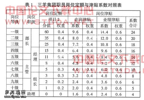 江西三羊集团公司是位于宜春高新技术开发区的一家集服装、电池、建材、地产开发、出口贸易的综合性高科技企业。在笔者对该公司咨询中,建议将不同工作类别职员按部长、经理、主管、组长、助理设5职等11职级。实施后职员年岗位工作量定额与津贴系数挂钩方法见表1。