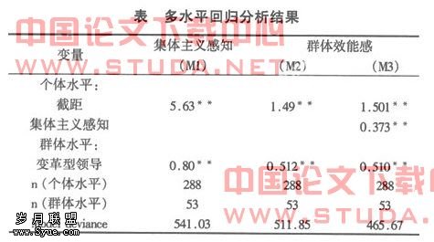 [关键词] 变革型领导行为;群体效能感;集体主义感知;多水平线性回归分析