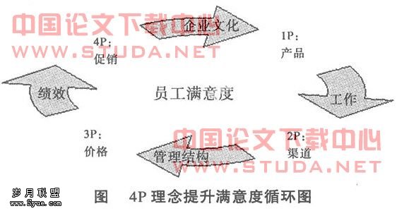 从一个侧面来说,人力资源管理实际上就是企业的内部客户关系管理,人力资源管理的政策、措施,就是企业的内部营销策略。没有满意的员工,就没有满意的客户,从这个意义上讲,员工就是企业的内部客户。营销致力于外部客户满意,那么以对待客户的方式看待员工,从而确保内部客户满意,人力资源管理的政策、措施,就是企业的内部营销策略。目前国内很多企业从一定程度上来说,人力资源管理仍然不过是“以企业为本”,而“以人为本”的企业,应该是平等、自愿、和谐、互惠、共赢的企业。只有以对待客户的方式看待员工,企业的人力资源工作才能做到真正意义上的“以人为本”,企业的内部客户满意才有可能真正实现。4P理念就是从员工的主观能动性出发,在产品(工作)、渠道(管理结构)、价格(绩效)和促销(企业文化)(如下图:4P理念提升满意度循环图)。