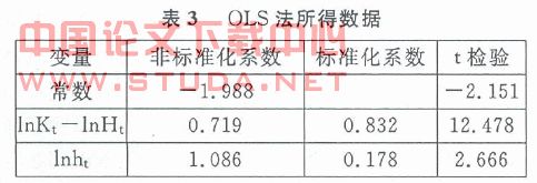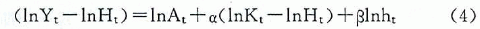 由于检验的有效性,因此由表3可知(lnK?t-lnH?t),lnh?t的标准化系数是0.832和0.178,,进而可得人力资本外部性标准函数是