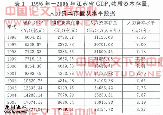 我们选择江苏1996年到2006年的国内生产总值作为产出的度量。选择该指标的理由主要有以下几点:1、从资料的收集来看,国内生产总值的数据容易获得(江苏的国内生产总值的数据可以直接从江苏统计年鉴中得到);2、地区生产总值反映了其经济规模,,而本文研究经济规模与人力资本的关系,所以选择国内生产总值来衡量产出Yt。并且按照居民消费价格指数将其调整到1996年的价格,这样就消除了通货膨胀的影响。?