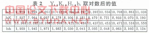 ? 对表1中的国内生产总值Y?t、物质资本存量K?t、从业人员的人力资本存量H?t和人力资本水平h?t个变量的时间序列数据分别取对数,得到新数据,如表2所示:?