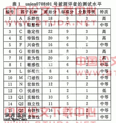 企业后备干部人员素质测评选用的测评工具直接影响测评结果的科学性和使用价值。不久前,我们经过考察和分析,采用了北京心灵方舟科技有限公司研发的《PsyKey人才测评系统》在学院人才测评技术研究与开发中心对苏州联通公司六县一市开展了企业后备干部(管理)人员心理测评。该系统依据心和人力资源管理方面的最新理论和研究成果,以心理结构为基本框架,以心理特质为单位,选用了在人事测评领域应用非常广泛的21个经典测验,对个体的个性品质、职业适应性、组织行为特点、能力、人际特征、管理技能等方面进行了测查和评估,测试个体的心理特征。本次测评工作中,围绕企业后备干部(管理)人员应该具备的能力素质,我们选用个性品质测验、职业适应性测验、组织行为特征测验、能力测验、人际特征测验、管理技能测验、作答诚实度测验。其中卡特尔16种人格因素问卷(16PF)可以得到16种主要的人格特质因素(如图1):乐群性、聪慧性、情绪稳定性、恃强性、兴奋性、有恒性、敢为性、敏感性、怀疑性、幻想性、世故性、忧虑性、实验性、独立性、自律性、紧张性,共有187个条目。职业兴趣测查表(VIS)测查个体的职业兴趣和能力特长,包括6个因子,分别是技能型、型、研究型、社会型、经营型、事务型。管理技能测验是管理者必须具备一定的技能才能做好管理工作,这些技能包括良好的沟通能力、协调人际冲突、激励员工、建设团队等。这部分提供七个测验,管理人际冲突能力评估、获取权力和影响力能力评估、激励员工能力评估、建设有效团队能力评估、时间管理能力评估、授权与委派能力评估、支持性沟通能力评估,有184个条目。通过测评了解了苏州联通公司管理人员的基本现状,为科学选拔后备干部人才作出有益的探索。《PsyKey人才测评系统》经过机处理系统自动生成每一位参加测试人员的个人信息、剖析图、结果分数、结果解释、背景知识、备注、详细反应等多部分组成的结果报表,报表对每一位被测者在十六项特质二十四要素上给出得分、百分位分数和总体评价。表1是我们从全体测评信息中选出的union0708t01号被测者,对照因子得分反映了被测者的人格特质,据以得到全体测评者的人格特质。?