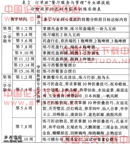 根据企业就业标准及行业情况确认专业核心技能,制定基于专业核心技能的分阶段技能训练目标,并按此目标强化技能训练学校根据企业的就业岗位目标要求确认核心技能以后,应组织专业教师立足行业发展实际,反复讨论、认真编制基于专业核心技能的分阶段培训目标,如《餐厅服务与管理》、《客房服务与管理》、《前厅服务与管理》等,同时,组织“订单班”学生利用学校旅游专业实训教学楼中现有的模拟客房、模拟餐厅、模拟前厅等设施,按照分阶段的专业技能培训目标强化技能训练。绍兴市职教中心旅游专业“订单班”《餐厅服务与管理》专业课分阶段目标的达标内容及训练安排见表2。