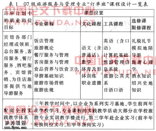 实现课程设置与就业岗位对接,确保学校教学的针对性和有效性具体的做法是学校根据专业所对应的岗位应具备和必须达到的能力确定学生应掌握的知识和技术、技能,并以此确定必修课程,建立必要的课程体系。课程设计要突出职业性及能力培养,与企业联合,按照职业岗位对知识和技能的要求设计专业课程。通过岗位分析,确定能力要素体系,强调能力培养,并由此形成“订单班”的教学特征。现行的中职教材内容重知识、重原理,理论知识偏多、原理偏难,既有悖于培养技能型人才的初衷,也给学生学习带来困难。中职课程内容要关注现实生产、生活,并为其服务。只有课程内容与社会生产、职业生活实际相联系,才能培养出社会需要的实用型人才。因此,在教学内容上应坚持岗位要求第一的原则,对基础课程以“必需、够用”为标准进行大幅度调整,删除课程中与岗位工作无关的内容,增加与岗位关系密切的内容,增强学生学习的针对性。绍兴市职教中心服务与管理专业“咸亨大酒店(五星级)订单班”的课程设计情况见表1。