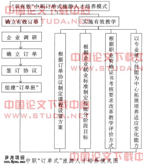 随着旅游产业的快速发展,一个十分广阔的就业市场正逐渐形成。绍兴市国民和社会发展第十一个五年规划纲要中提出到2010年旅游总收入突破200亿元的目标。现在,绍兴地区旅游收入正以每年20%的速度递增,对旅游从业人员的需求以每年25%的速度增长,旅游产业已成为第三产业中对中职人才需求量最大的行业。经过长期的实践研究,绍兴市职教中心摸索出一种新型的“双有效”中职“订单式”旅游人才培养模式。概括起来,就是以就业为导向,从企业需求出发,立足优化教学环节,创建以“确立有效订单”和“实施有效教学”为重点的中职“订单式”旅游人才培养模式,如下图所示: