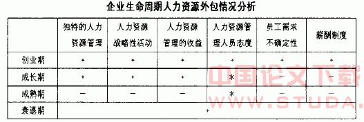 处于企业不同阶段的人力资源管理特点是不同的,企业可以根据各阶段人力资源外包影响因素分析结果,采取适合的外包策略(下表是企业生命周期人力资源外包情况分析)。