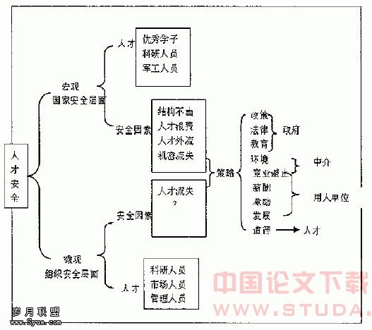 通过以上框架图可以看出:目前对宏观层面上人才安全的研究成果较多,认识也比较深入;而对微观层面上人才安全因素的研究不足。