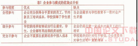 (2)部分参与。这种模式是企业不介入学校教学过程,而是以专业指导委员会的形式向学校提供行业发展需求和用人单位的招工意愿,并接纳学生实习。无锡南洋职业技术学院与香港名人城市酒店集团合办的“名人城市酒店班”就属于这种模式。