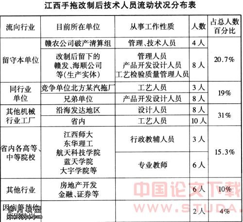 江西手扶拖拉机厂改制后工程技术人员的流动并不是独一的案例,其流动的方向和特征是有代表性的。改制带来的人才合理流动,给人才市场输送了大批的新鲜“血液”,实现了人力资源的重组。企业得到了所需的人才,工程技术人员改善了自身待遇,生产力得到了极大的解放。