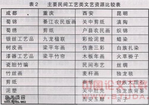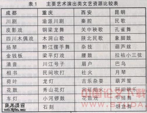 成都地处西部,我们在做城市比较分析的时候选取了西部其他几个在艺术类文化资源方面有代表性的旅游城市,分别是重庆,西安与昆明。对比情况见表1,表2。