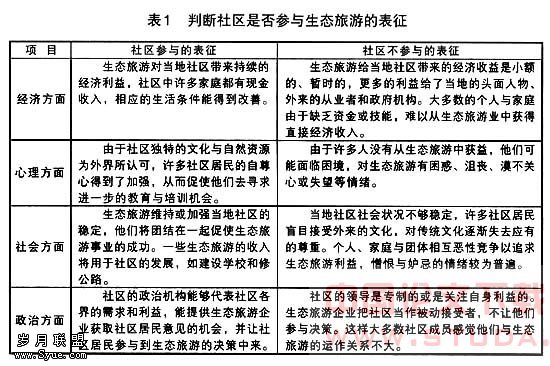表1中列出了社区是否参与生态旅游的一些表征,可以看出,社区参与有助于生态旅游事业的发展和社区的社会经济进步。并使我们进一步理解生态旅游发展中的社区参与理念。