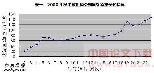 针对世博会,旅行社的客源预测工作主要包括两个方面,一是世博会前后和世博会期间客源数量以及不同阶段的客源数量变化;二是世博会所带来的客源的市场结构分析,主要是境内游客和境外游客分析。首先旅行社应该进行客源数量分析,预测世博会期间的客源高峰以及世博会后客源回落的状况。如2000年汉诺威世博会期间客流变化情况如表一所示: