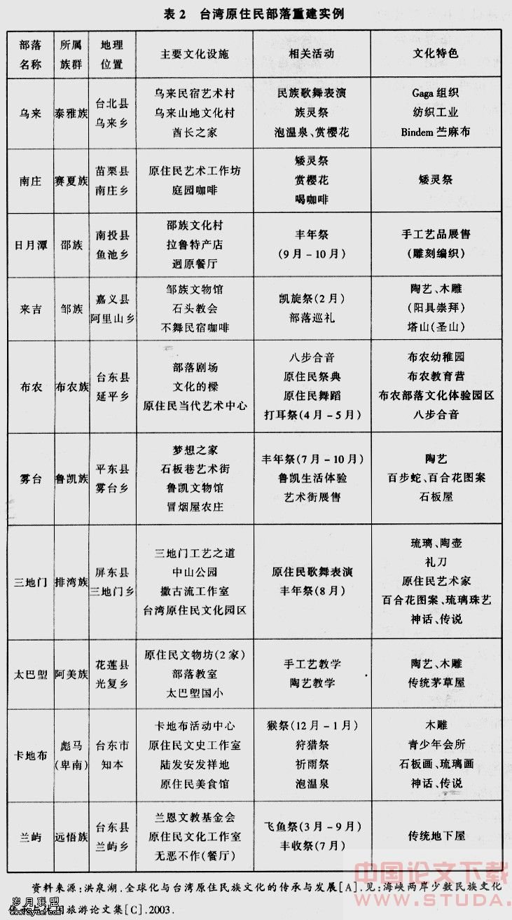 从旅游资源的状况看,台湾原住民部落与大陆的少数民族社区有很多的相似性。那里不仅有优美的自然风光、良好的生态环境,而且传统的服饰、建筑、歌舞、手工艺品、神话传说、宗教信仰等,都具有较高的旅游吸引价值,是宝贵的旅游资源。本文试图从台湾原住民部落观光营造的理念和实践中,为大陆的少数民族社区旅游开发提供借鉴。
