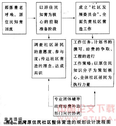以台湾台东县卑南族部落营造为例。·台东县卑南族部落营造依靠的主要力量是一批出于保留母文化的目的,回到家乡承担起部落重建的年轻人。他们在部落耆老的号召下,从谋生地返回部落从事部落营造工作。他们的主要工作是:调查部落族人对部落营造的态度,传达部落营造的理念,组织部落族人对部落营造的设想进行反复的商讨,最终达成共识;在部落耆老的协助下,成立“社区发展委员会”,并负责部落营造的全面工作,包括部落营造规划书的撰写、部落营造经费的筹措、营造工程项目的实施等。在此过程中,台湾的文建会、台东县文化局和城乡局,仅对台东地区的原住民部落营造提供了经费辅助和专业辅导。而专业规划团体也只对规划方案的制定和工程项目的具体实施进行必要的指导。