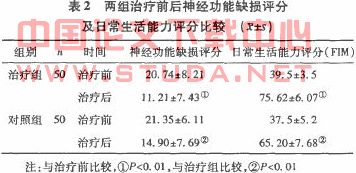 由表2分析可以看出治疗组神经功能缺损评分及日常生活能力评分较治疗前显著改善,而且明显优于对照组,提示针药结合能明显提高患者肢体功能,同时也改善了患者日常生活能力。