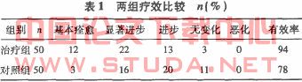 由表1可见治疗组总有效率为94%,对照组总有效率为78%,经统计学处理,)c2=12.31,P<0.05,两组有效率比较差异有统计学意义,表明治疗组疗效明显优于对照组。
