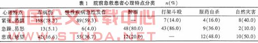 3.1.2急躁、易怒由表1可见,此种心理最多见于醉酒和打架斗殴受伤的患者。原因在于这2类患者通常有长期的不良情绪积累,往往在近期工作和家庭生活中有应激事件发生,一旦有适宜诱因(如饮酒、口角、纠纷等)激化矛盾即出现爆发。此类患者由于病情急、危、重。家属也带有情绪,心理上更加难以承受.自制能力下降,易产生急躁心理,就诊时稍有不顺,患者就会怨言很多,脾气暴躁,甚至对外采取攻击性态度。例如酗酒的患者处于极度兴奋状态,往往失去理智,有的还伴有外伤。如果医护人员不及时了解受伤过程和部位就大怒,误认为没有及时处置,或认为医护人员的服务态度不好,因而出现暴躁行为,甚至有辱骂、殴打医护人员的过激行为:严重者产生抗拒心理,拒绝各种与护理,表现为不与医护人员合作,自行拔除各种导管或者大吵大闹;还有些患者无法理性思考.对正常的收费或医疗程序即感觉烦躁,认为“费用高、手续多”,或因划价、交费等手续烦琐而“积怨在心”,在这种情况下,急诊护士稍有不慎,就会引发患者的过激言行。