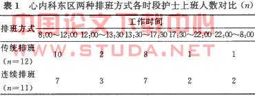 以心内科东区排班为例 (表 1),设办公 护士 1名,工作时间为 8:0O~12:0O和 13:30~17:30,每月轮换一次 iE班护士 5~6名 ,工作时间为 7:3O~15:oO;L 班护 士 2~ 3名 ,工作 时 间为 14:30~22:O0。N班有两种模式 ,一种 为 2名护士共同值班,时间为 22:O0~8:00;另一种为 1名护士 22:0O~8:00值班 ,另由 1名 当 日 L班 当值组 长上加强班。加强班护士可于 22:O0~6:00在科室休息 ,期间遇抢救等特殊情况 时参与值班。这 样既加强 了14:30~22:00和 6:O0~8:00工作繁忙时段的护理力量 ,又避免了 22:O0~6:00工作量相对较少的时段浪费人力资源 ;每 日只交接班 3次(分别在 8:OO、15:00和 22:00)。