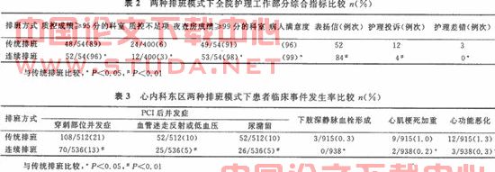 2.3 连续性排班对护理管理的影响 各班值班人数相对充足,层次和职责分明,有利于对患者的观察和危重病人的组织抢救,避免了传统 中午班 和夜班1名护士值班忙不过来的现象。病房护理质量 由责任组长和当值组长监控和指导,认真落实并严格把关 ,特别有助于危重患者和特殊患者的护理,有利于护士长对病房的管理。