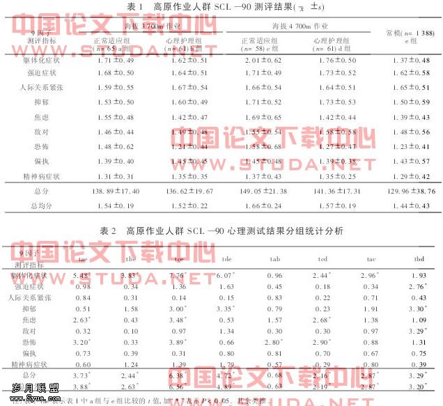 2 比转不同海仿作朴人群的心理测试结果不同海拔两个正常适应组比较(tdc),高海拔的总分、总分、总均分均高于低海拔组,经统计学检验,差别有显著性意义;9因了均分比较,高海拔组各因了均分均高于低海拔组,但经统计学检验仅躯体化症状一项差别有显著性意义。不同海拔两个心理护理组比较(tbd) ,高海拔组的总分和均分同样高于低海拔组,经统计学检验差别有显著性意义;9因了均分比较,高海拔组人群的强迫症状、抑郁症状敌对症状三项因了测评分高于低海拔组,经统计学检验差别有显著性意义。不同海拔的施工人群,其心理反应程度不同。这是由于高海拔地区作为应激原的气候环境较低海拔地区更加恶劣,对机体产生的刺激强度大,心理应激也更为强烈。