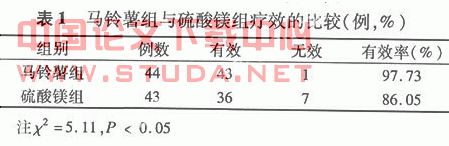 马铃薯切片贴敷显效率为97.73%,硫酸镁组显效率为86.05%,两组比较有显著性差异