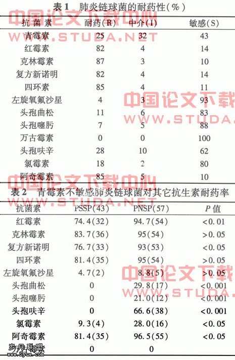 2.1 100株肺炎链球菌的耐药性分析 根据NCCLS判定标准,肺炎链球菌对青霉素MIC≤0.06 mg/L为敏感株(PSSP),MIC在0.1~1.0 mg/L之间为中度耐药株(PISP)、MIC≥2 mg/L为高度耐药株(PRSP)。PISP和PRSP统称为青霉素不敏感株(PNSP)。用琼脂稀释法对100株肺炎链球菌进行了耐药测定,结果见表1。 ?