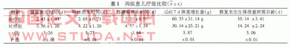 1.4 监测指标 腹胀消失时间,呕吐消失时间,胃潴留消失时间,用药7 d体质量增长量,恢复至出生体重所需日龄。药物不良反应的监测:观察用药前后检测肝功能。?